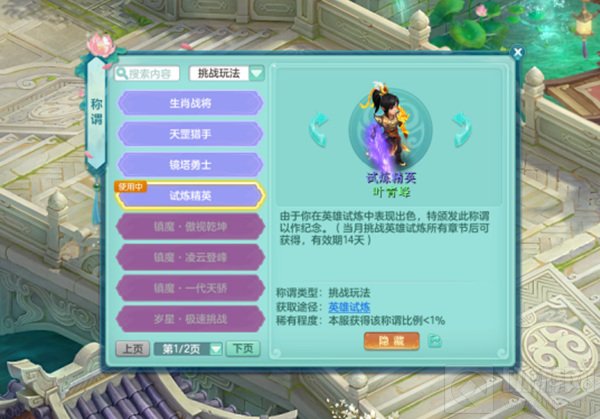 称谓界面也将在本次的更新后进行迭代。与原来的称谓界面相比,新增了称谓预览、搜索等功能,称谓的选择及其获取途径一目了然。除此之外,新增了十二生肖和三十六天罡等挑战玩法相关的新称谓,欢迎少侠们前去探索获得。