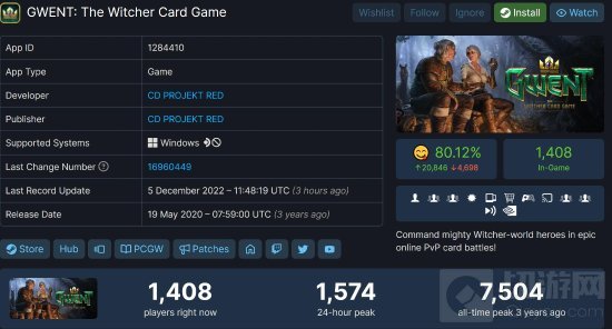 《巫师之昆特牌》是由CD Project RED制作的回合制卡牌游戏,本作脱胎于《巫师3:狂猎》中广受好评的同名卡牌游戏,游戏机制非常简单,只需几分钟就能快速上手。根据SteamDB界面显示,目前游戏尚有1500余人的日在线峰值。