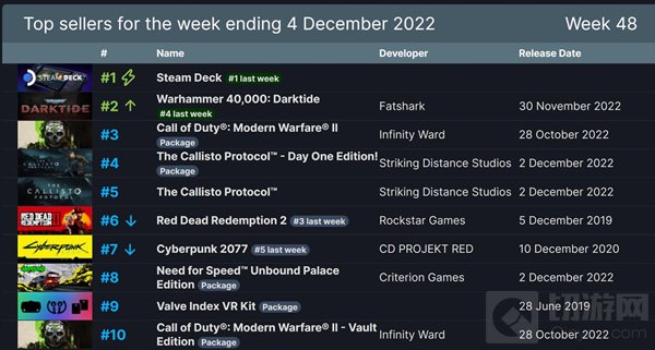 Steam公开了最新一周(11月28日至12月4日)的游戏销量榜,其中由于Steam Deck因为在亚洲地区正式发售,使得其继续夺得了冠军的宝座,之后便是上周刚发售的《战锤40K:暗潮》第二名和《死亡空间》精神续作《木卫四协议》两个版本占据第4和第5名。发售近半个月的《使命召唤19》依旧保持两个版本上榜。下面让我们一起来看看吧!