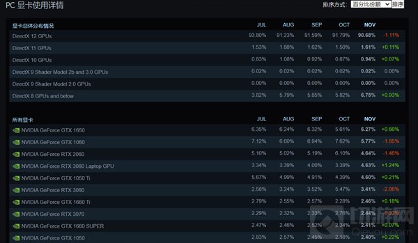 GTX 1650占有率达到6.27%,GTX 1060占有率为5.77%。相比10月,GTX 1060占有率大幅度下降了1.85%,使得GTX 1650有机会首次登顶。