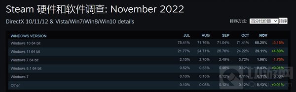 操作系统方面,Win10占比最多(68.25%)但相较10月份下降了3.16%,而Win11则持续上涨,相比10月占有率上涨4.89%,目前排名第二。