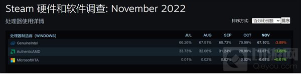 CPU方面,32.87%的Steam用户选择了AMD,而英特尔CPU份额下降了3.89%,跌至67.10%,双方之间的差距再次缩小,这或许与AMD的降价策略有关。