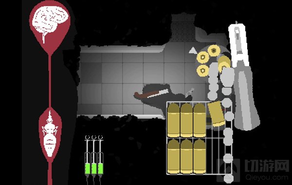 因此寄生虫离大脑的距离就是血量条,除了突变怪物,时间也是玩家的敌人,就算什麽事都不做,寄生虫也会慢慢前进。玩家必须争分夺秒,同时四处收集作为补血药的血清让寄生虫后退,这也代表玩家战斗时不能随意受伤,免得击退了敌人,却因为寄生虫到达脑部而失败。本作还恶趣味的在重要的物资箱上设置了解谜式开锁,玩家想要打开箱子就需要解开谜题,进一步消耗玩家的时间。