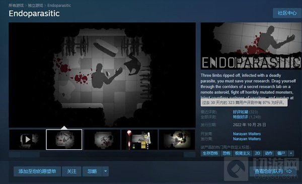 今天小编来为大家推荐一看10月底上架Steam的好评恐怖游戏——《Endoparasitic》。虽然游戏里玩家可以使用各种武器对抗怪物,不过不同的是开局玩家控制的角色就惨遭怪物肢解,最后只剩下一只右手,移动、互动、攻击只能全靠这只仅存的手臂。目前游戏在Steam上好评率高达97%,下面让我们一起来看看吧!
