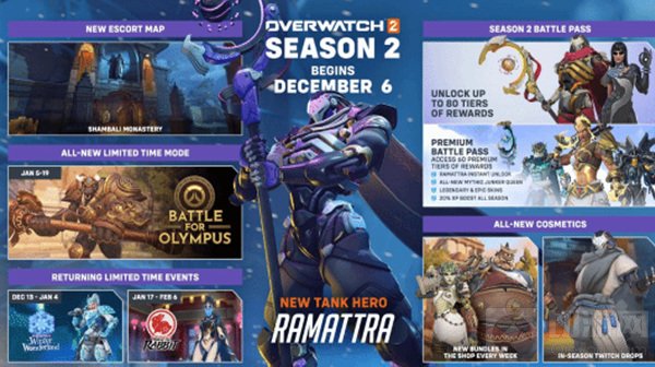 《守望先锋》“归来”第二赛季将于12月7日开启,新赛季通行证主题是希腊神话,全新神话皮肤为渣客镇女王“宙斯”。除了新地图外,新PVP模式“奥林匹斯之战”以及新英雄拉玛刹也将同步上线。