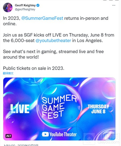 主持人Geoff Keighley宣布2023年的夏日游戏节将回归线下(同步线上直播),将于2023年6月8号在洛杉矶举行,现场提供了6000个座位,门票将于明年对公众开售。