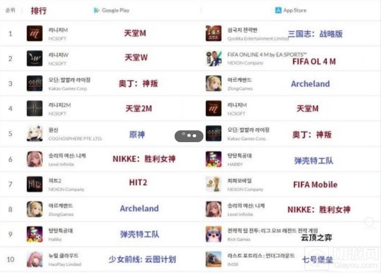 韩国地区App Store畅销榜第一,由国产手游《三国志:战略版》获得。排行第二,由《FIFA OL 4 M》获得;排行第三,由国产手游《Archeland》获得。