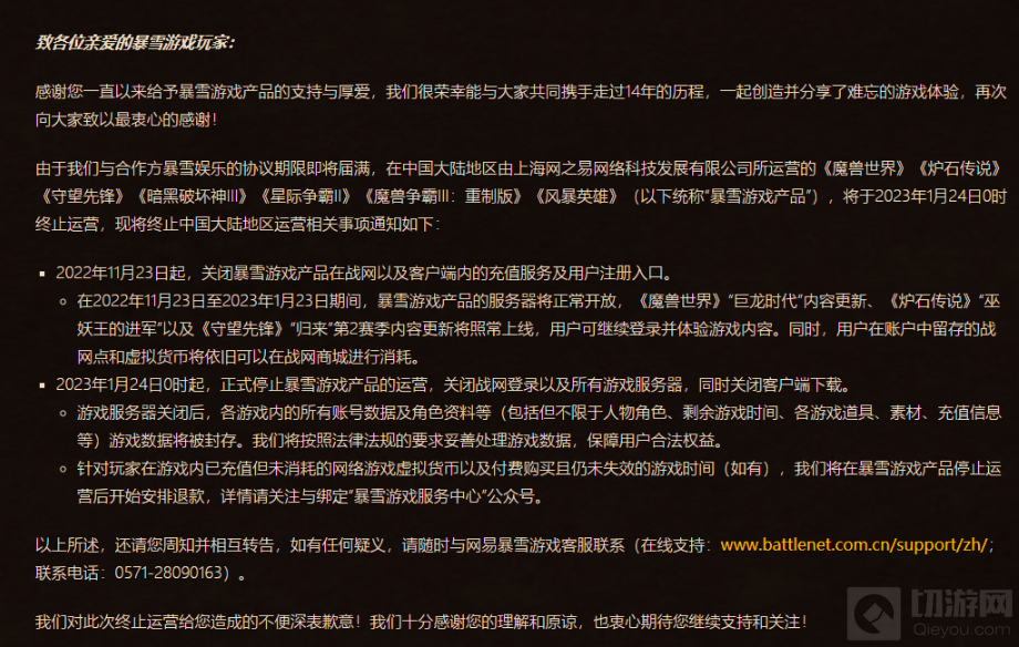 11月17日暴雪娱乐发布声明称,由于同网易的现有授权协议将在2023年1月23日到期,将暂停在中国大陆的大部分暴雪游戏服务,包括《魔兽世界》《炉石传说》《守望先锋》《星际争霸》《魔兽争霸2: 重置版》《暗黑破坏神3》和《风暴英雄》等游戏届时将会停运。