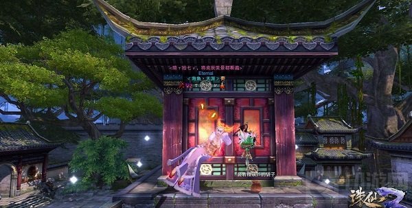 这里需要注意的是,到了帐篷上以后,旁边有一根树藤,要往树藤那儿靠一靠(如图所示),然后再御空跳上屋檐。