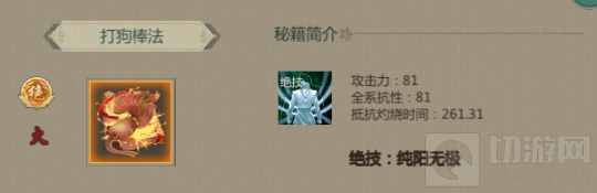 4.《打狗棒法》金色通用攻击力秘籍,效果为攻击力、全系抗性、抵抗灼烧效果,获取方式为秘籍抽取或者拍卖获得,未获得此秘籍可以使用《玄冰碧火功》等紫色通用攻击力秘籍。