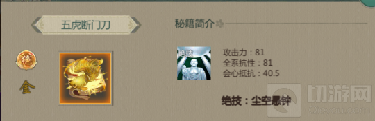 2,《五虎断门刀》金色通用攻击力秘籍,效果为攻击力、全系抗性、会心抵抗,获取方式为秘籍抽取或者拍卖获得,未获得此秘籍可以使用《玄冰碧火功》等紫色通用攻击力秘籍。