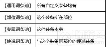 自定义史诗专属的系统,目的是把一件105级自定义史诗装备的某一个词条换成另一个词条,主要的词条池见下图,一共有四个范围,传说词条池目前已知只能从传说装备上获取。