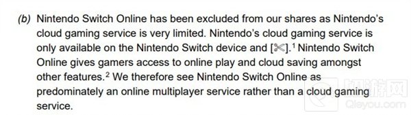 一位ResetEra论坛用户发现,在这份CMA的文件的第九页写道:“任天堂Switch Online已被排除在我们的股份之外,因为任天堂的云游戏服务非常有限。任天堂的云游戏服务仅适用于Nintendo Switch设备和[已编辑]。”