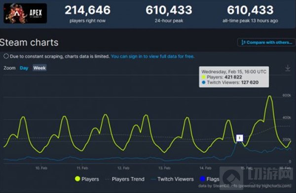 《APEX英雄》的此次更新,炸出了不少潜水玩家。昨日,这款游戏在Steam在线人数这项数据上,就创造了61万的新纪录。同时,这项数据也表明了《APEX英雄》多年来所积累的庞大玩家基数,以及长期运营下去的潜力。