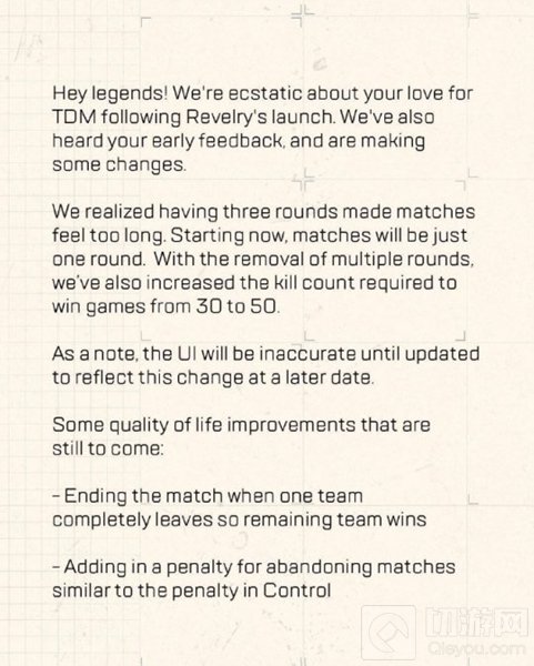 好在玩家们的反馈,很快就得到了回应。目前《APEX英雄》已经发布了公告,针对“死斗模式”的几大痛点进行了优化。在后续的版本中,对局只会设置一轮,只要有一方的击杀数达到50就能获胜。秒退会有惩罚,如果其中一方全部退出,另外一方则直接取胜。