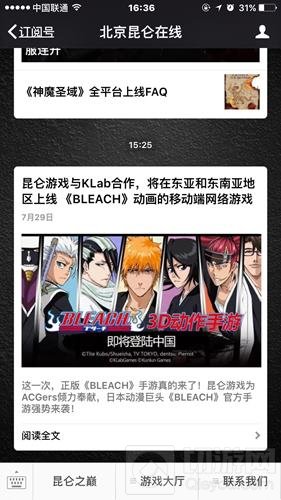 7月29日,昆仑游戏官方微信宣布与KLab株式会社合作,将面向东亚及东南亚地区发布热门动画《死神》的移动游戏。