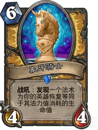 象牙骑士,6费,圣骑士职业随从,4/4身材,战吼:发现一个法术并为你的英雄回复等同于其法力值消耗的血量,我已经统计了炉石传说里所有的法术,其他人帮我算了一下不同法力值法术的出现的概率统计情况,得到5费或者5费以上卡牌的概率是33%,而得到8费或者8费以上法术的概率是20%,得到2费以及两费以上法术的概率有92%,所以基本上打出这张牌是不亏的,甚至可能发生你意想不到的效果。
