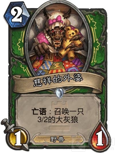 对于猎人他们给出了慈祥的外婆,2费1/1身材的野兽,亡语召唤一个3/2身材的大坏狼,当然也是野兽。显而易见这是一个非常强力的生物,它让我们想起从前一张很强力的2费卡牌——鬼灵蜘蛛,它有着1/2的身材,亡语召唤两个1/1的小蜘蛛,我认为狼外婆甚至要比鬼灵蜘蛛更强一些,因为在我眼里1个3/2是要比两个1/1好的,因为不会被横扫这种不明AOE顺带干死,像这种强力的低费亡语生物在将来卡组的更新中一定会看到他的身影。【K神已经钦定了,你们服不服?】