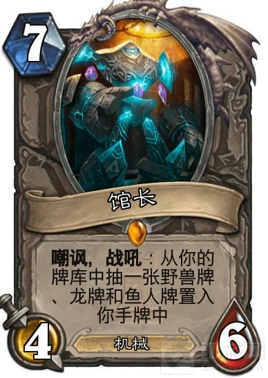馆长,7费4/6嘲讽,战吼:从你的牌库中抽一张野兽牌、龙牌和鱼人牌,植入你手牌中。