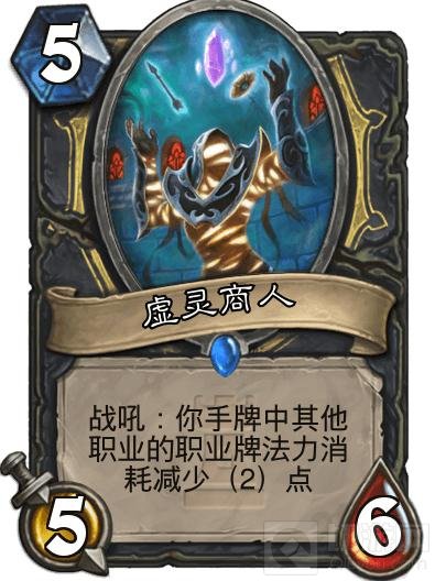 而对于盗贼,他们释出了5费5/6这张牌,虚灵商人,战吼:你手牌中其他职业的职业牌法力消耗减少(2)点。