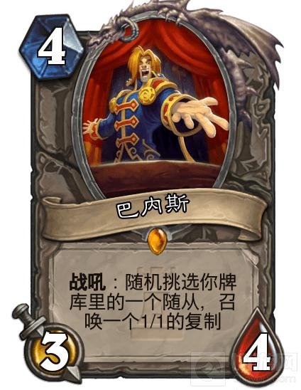 4费3/4巴内斯,传说随从,战吼,召唤一个你手牌balabala(这个我就不翻译了),这就意味着,如果复制的是一个嘲讽随从,那这个11就是嘲讽的,而战吼效果则没什么卵用,但是很多光环效果和亡语效果的随从依然会有很多的发挥空间,然而4费3/4召唤一个1/1,从简单模型上来看并不如4费4/5。