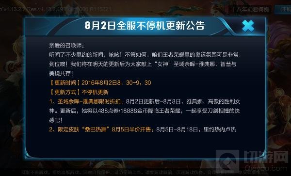答:王者荣耀本次具体的更新时间是2016年8月2日8:30到9:30,更新方式是不停机更新,不会影响玩家的游戏,更新范围是全服。届时,期待已久的女神雅典娜将正式上线。