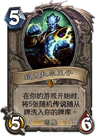 玛克扎尔王子:橙卡,5费,身材5/6,特效:在本局游戏开始时,将5张随机的传说随从加入你的牌库中。