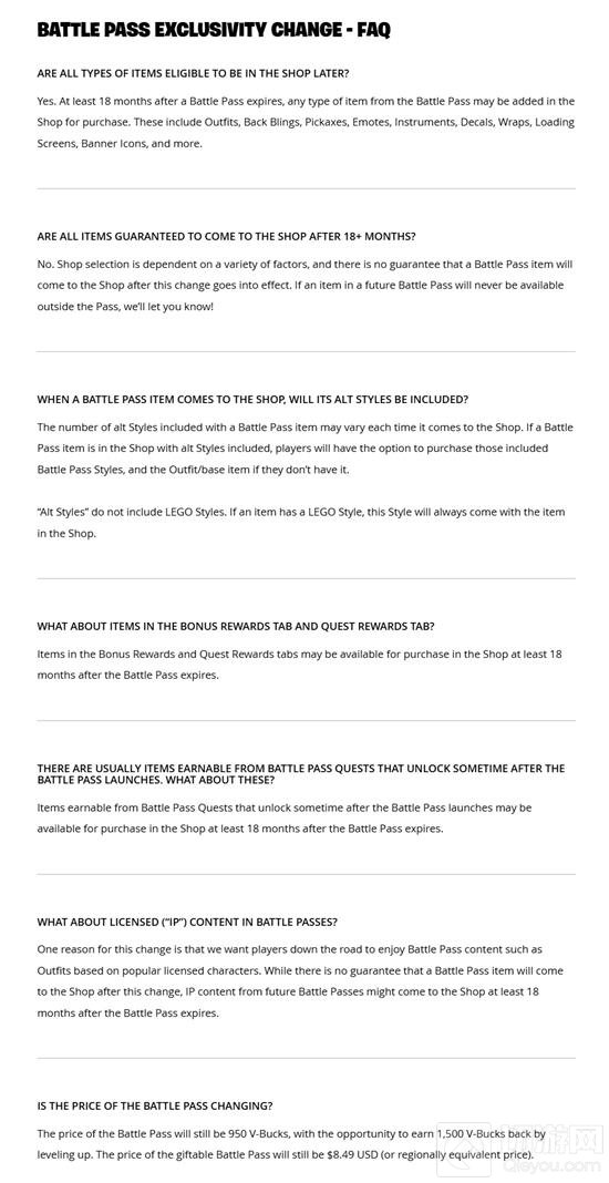 Epic在常见问题解答(FAQ)中指出,并非所有物品都能保证在18个月后出现在商店中。商店的选择取决于多种因素,并没有保证战斗通行证物品在这一改变生效后一定会进入商店。如果未来战斗通行证中的某个物品永远不会在通行证之外提供,Epic将会告知玩家。Epic还提到,做出这一改变的一个原因是希望玩家能够在将来享受基于流行授权角色的服装等战斗通行证内容。这一举措将使Epic能够从战斗通行证以外的皮肤中获得更多收入,而战斗通行证的价格仍将保持在950 V-Bucks。