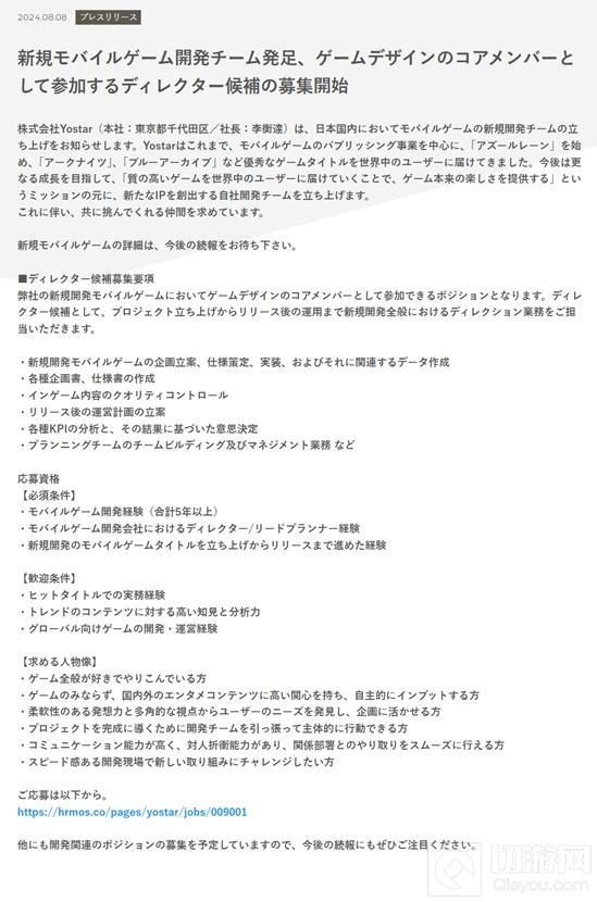 此外,Yostar还公布了导演候选人的招聘要求,包括必须具备超过5年的移动游戏开发经验,有作为导演或主策划的经验,以及成功推进新开发移动游戏从启动到发布的完整经验。公司还欢迎具有热门游戏实际工作经验、对趋势内容有深刻理解和分析能力、以及具有全球游戏开发和运营经验的人才。具体的招募要求原文如下。