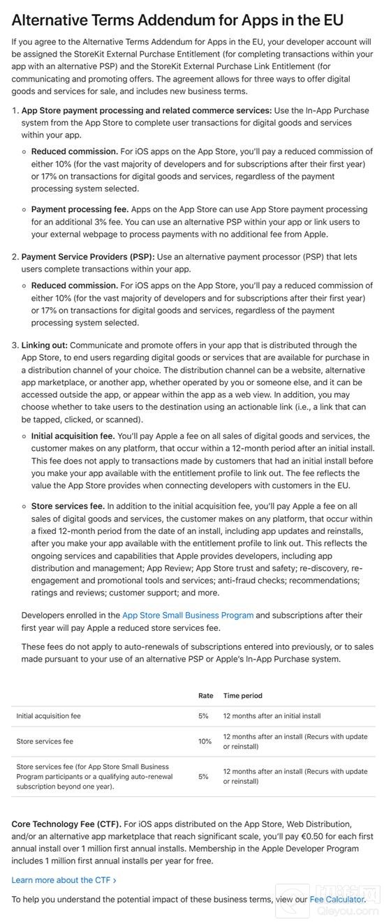 这些费用是在已经宣布的核心技术费之上的,核心技术费是每首次安装每年收取0.50欧元,适用于前一百万个安装。苹果现有团队的开发者通过外部链接进行的销售将被收取20%的费用,尽管对于小型企业这一比例降至7%。