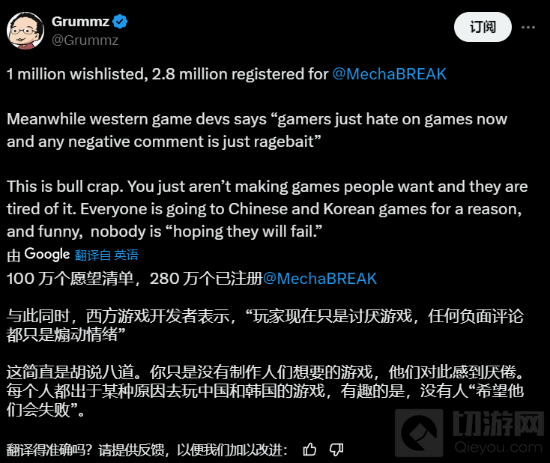近日,前暴雪制作人、知名爆料人 Grummz在推特上转发了《解限机》官方宣布Beta测试结束的消息,并对游戏在测试期间的表现给予了高度评价。他指出,有100万人将《解限机》加入了Steam愿望清单,同时有280万人进行了预约,这一成绩是对游戏优秀品质的证明。然而,Grummz对一些西方游戏开发者的观点表示了不满,他们认为玩家对游戏的负面评论只是情绪煽动,对此Grummz认为这是无稽之谈,并强调西方开发者没有制作出玩家真正想要的游戏,而中国和韩国的游戏却受到了广泛欢迎。