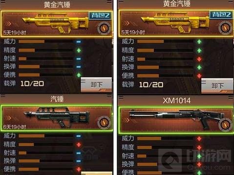 Xm1014这一把连喷,可以说在散弹枪里面也是不错的,那么它和黄金汽锤比有何区别呢?我们可以看到黄金汽锤的威力、精度和换弹速度都要比xm1014逊色不少,美中不足的就是这一把枪的射速和便携没xm1014来得好。这点玩家还是要特别注意一下的。