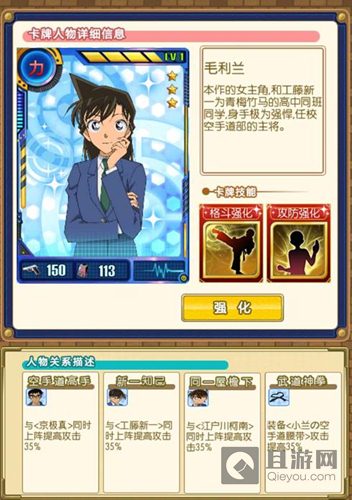 以卡牌“毛利兰”为例,她与京极真、工藤新一、江户川柯南分别有一个关系,当这些与卡牌有关系的卡牌也一起参加到阵容中的时候,“毛利兰”的实力就会大幅提升了。比如毛利兰和京极真的关系时“空手道高手”——与<京极真>同时上阵提高攻击35%。