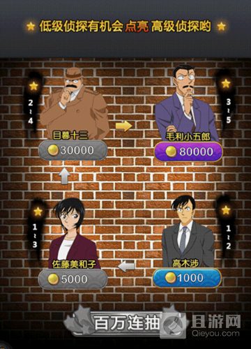 在侦探事务所抽卡可以通过金币与4个NPC交易获得卡牌,分别是高木涉(1000金币)、佐藤美和子(5000金币)、目暮十三(30000金币)、毛利小五郎(80000金币)。每次与低级侦探都有概率点亮高级侦探,点亮高级侦探毛利小五郎 就有概率获得五星卡牌,当然,你也可以直接花150个钻石与毛利小五郎交易。小编觉得这个比活动里的基德彩蛋好多了,你只需要用金币,不需要花费钻石就有概率获得五星卡牌,如果你想直接花费钻石,一次彩蛋就可以点两次毛利小五郎,次数多了获得五星卡牌的概率自然就高了,所以是平民玩家的首选哦。