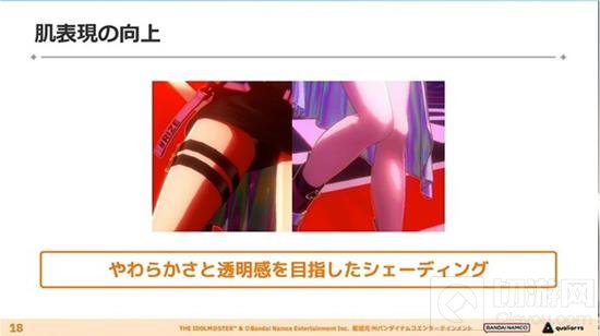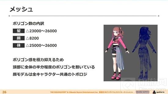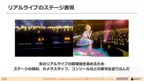 在角色模型的制作上,开发者注重了在不同光线下偶像的闪耀效果,力求通过各种演出性的光线创造出有魅力的画面。他们对头发的细节、肌肤的柔软和透明感进行了精细的描绘,并针对每个偶像的个性,对肌肉和轮廓进行了精心的建模和纹理处理。此外,偶像的服装设计也追求一种类似于"战斗服变形的特殊感和迫力",并且在表演中通过使用五种不同的汗水表现来增强真实感。为了减少多边形感并保持模型的平滑轮廓和适当的阴影,开发者在头部使用了大约一半的多边形,并为模型的骨骼使用了321根骨头。在角色的光照方面,使用了五种灯光功能来避免不必要的阴影,并通过多种颜色的光照实现了柔和的照明效果。每个角色使用了9种不同的着色器和9到11种材料,以及8种纹理。