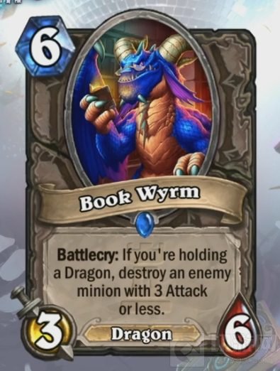 书呆龙(Book Wyrm):6费,身材3/6,特效:若你的手牌中有龙牌,便消灭一个3攻或者3攻以下的敌方随从。