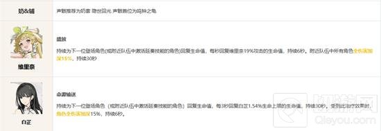 - 维里奈 的“盛放”技能为队伍提供持续的生命回复,并且增加全体成员的伤害加深效果,显著增强了队伍的续航力与爆发力。