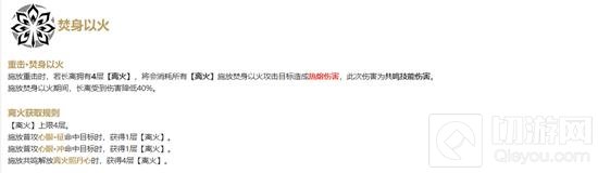 接下来是共鸣回路“焚身以火”。这项技能的设计思路在于通过积累“离火”来触发更为强劲的攻击模式。具体来说,当长离积攒满四层“离火”时,施放重击就会触发“焚身以火”,对目标造成巨大热熔伤害的同时,自身也会进入一个短暂的无敌状态,大大增强了生存能力。值得注意的是,获得“离火”的途径多样,包括使用“普攻·心眼·征”或“普攻·心眼·冲”命中敌人,以及释放共鸣解放技能“离火照丹心”。这意味着玩家需要合理安排战斗节奏,确保在关键时刻能够及时触发“焚身以火”。此外,“焚身以火”的分支强化还包括了两个固有技能——“潜谋”与“散势”,前者能在使用特定技能时提升热熔伤害加成,后者则无视部分目标防御,进一步强化了长离的输出效率。