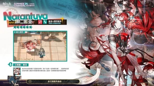 《明日方舟》是一款策略性角色扮演游戏,娜仁图亚是游戏中一个在五周年期间实装的六星干员。娜仁图亚具有回环射手的特性,这意味着她需要持有回旋投射物才能进行攻击,而这些投射物需要时间回收。