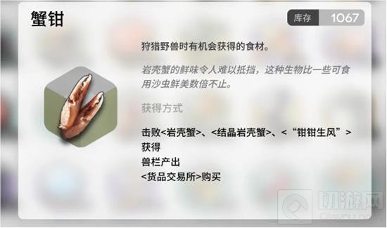2.蟹钳:最常见的食材,用于与“清水”和其他食材制作食品;制作能量饮料。可通过击败岩壳蟹、结晶岩壳蟹、“钳钳生风”获得(分别掉落1个、1个、5个),也可通过兽栏产出或在货品交易所购买。
