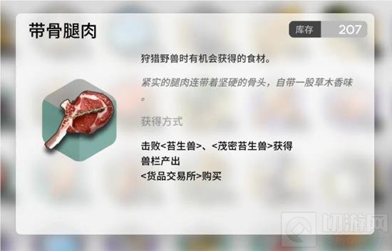 5.带骨腿肉:较为稀有的食材,用于与“清水”和其他食材制作食品;制作能量饮料。可通过击败苔生兽、茂密苔生兽获得,也可通过奇遇获得。