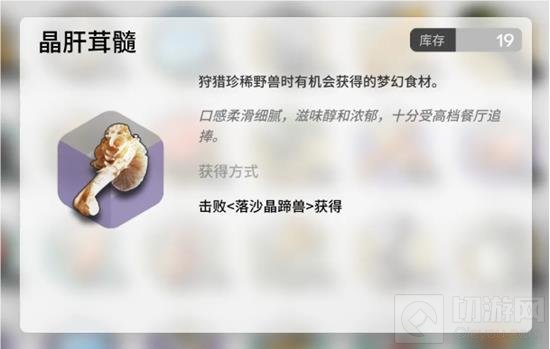 6.晶肝茸髓:稀有食材,用于与“清水”和其他食材制作食品;制作能量饮料。可通过击败落砂晶蹄兽获得。