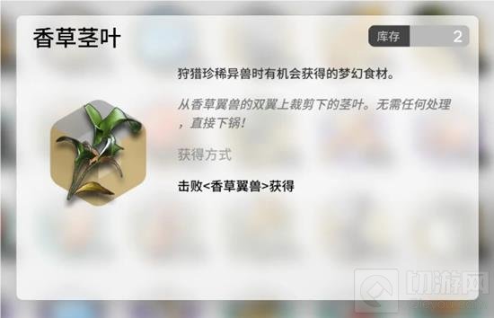 9.香草茎叶:新出的食材,极其稀有,用于与“清水”和其他食材制作高级食品;制作能量饮料。可通过击败香草翼兽获得。