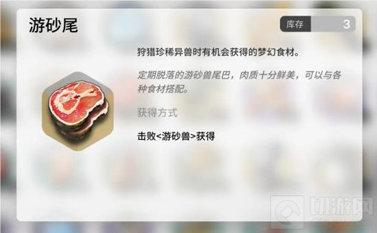 10.游砂尾:新出的食材,极其稀有,用于与“清水”和其他食材制作高级食品;制作能量饮料。可通过击败游砂兽获得。