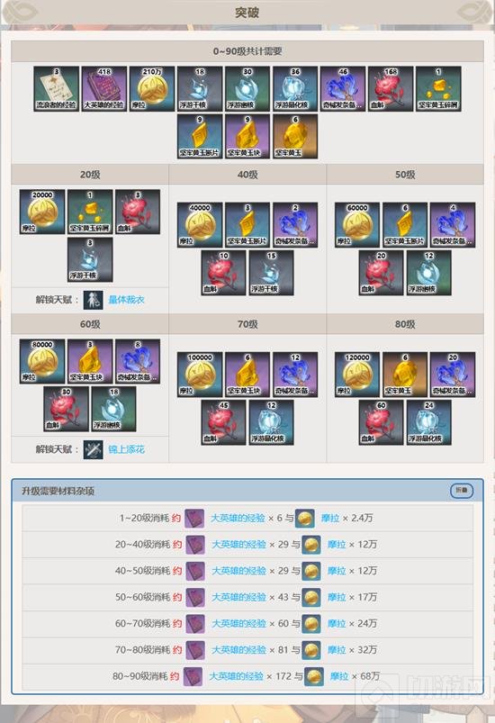 4、60级突破材料有80000摩拉、坚牢黄玉块3个、奇械发条备件,歌裴莉娅8个、血斛30个和浮游幽核18个。