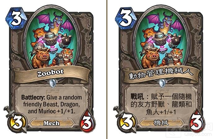 动物园机器人,中立3费33,本身机械属性,战吼:随机给友方的一个野兽、一个龙和一个鱼人+1/+1