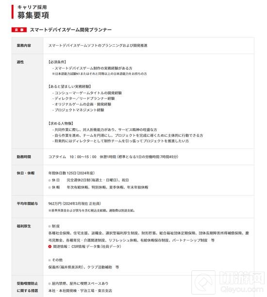 负责手游的策划和开发推进,需要N1或同等水平的日语能力,需要有上市手游开发经验、导演、原创游戏策划开发经验、项目管理经验。标准日工作时间7小时45分钟,每周双休、节假日休息、有各种休假政策,年休息125天,平均年收入962万日元,有如图所述的福利待遇。