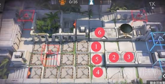 如图所示,开局之后在【1】手长的近卫(实测拉普兰德最优),之后在【2】处补群狙(白雪即可),【3】处补群奶朝左(单奶也行,但是此时对应的4处最好带塞雷娅),【4】处用重装扛住或者用手长的近卫点掉,【5】处可以视情况放棘刺或者号角,【6】处随意可以放个狙什么的用来缓解中路压力(记得朝左)。之后挂机等通关即可。