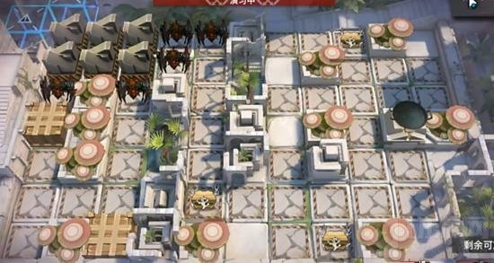 如图所示,在先把右上角的大蘑菇砍掉,然后放个澄闪,澄闪那一格的左边有个宝箱,开开之后有加攻速的饮料,这个给澄闪,之后其他食物放锅中等开饭,开饭之后所有食物都留给澄闪让她不断地开技能。澄闪的技能攻击范围是全图,因此这样可以无视敌人的位置,直接打离家门最近的敌人。