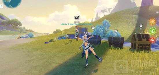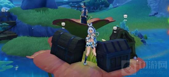 对应的NPC在水域边上的一朵花里。完成此处勇士的挑战,到达一定分数后会出现系列宝箱,其中的珍贵宝箱可以开出1个湛蓝曜石断片,是重要的合成道具。